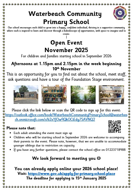 Thank you for considering Waterbeach Community Primary School for your child. Please see the information below about our upcoming Open Event in November where we look forward to welcoming your family to our school community.